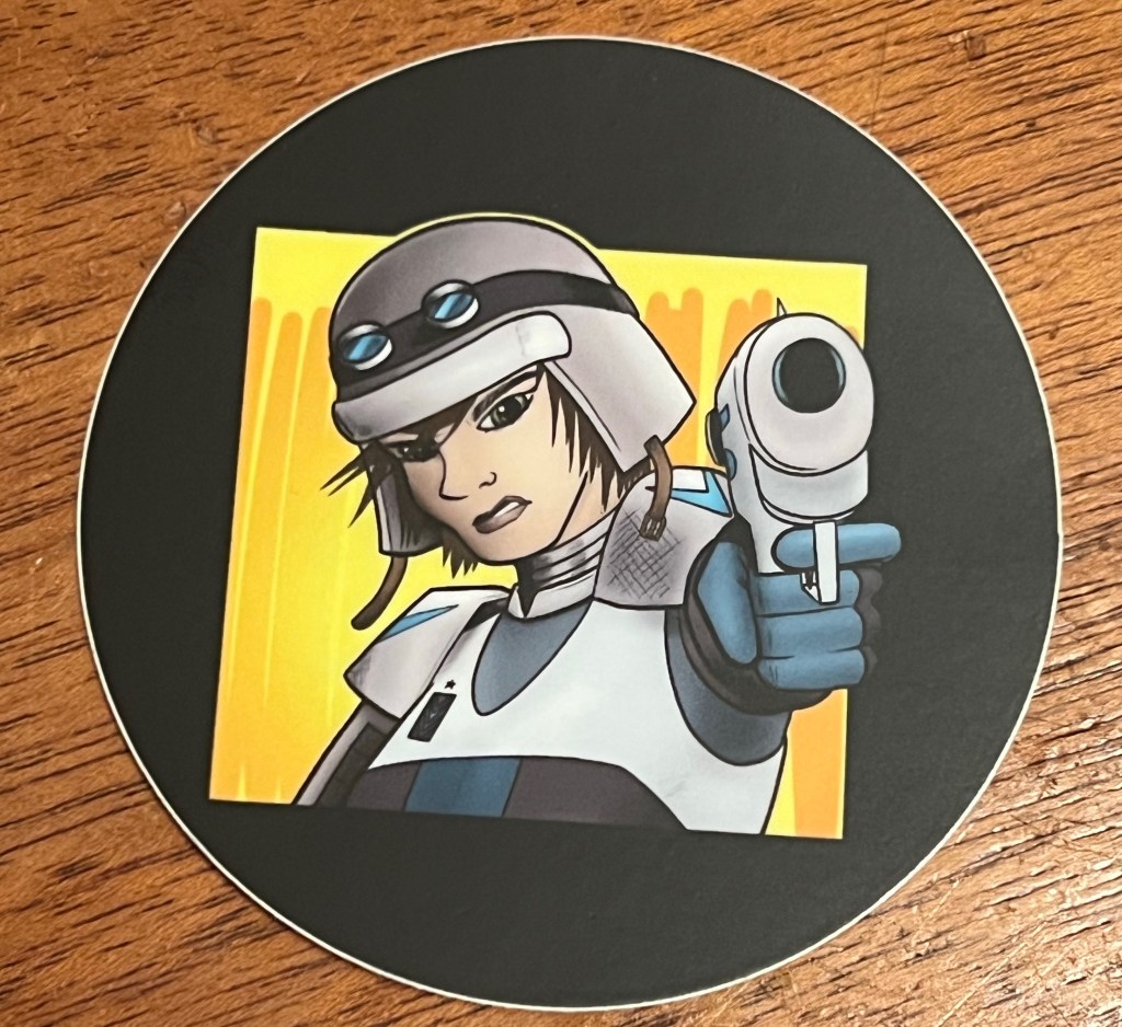 A small sticker with Commander Jarri Akada from The Avandrus Theory #2.